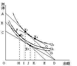 答えなさい。 図において,AD=比例所得税が課される前の予算線(稼得機会線),CD=控除の ない比例所得税が課された時の予算線(稼得機会線),U1〜U3 =無差別曲線で右上方にあるものほど大きな効用を表す,E1=課税前の均 衡点(効用最大点),E2=課税後の均衡点(効用最大点)である。また, 所得Yと余暇時間Lとの間には,当初,Y=w(24−L),ただしw=時間給,という関係が あり,課税後は, Y=(1−t)w(24−L),ただしt=比例所得税の税率,という関係がある。 |